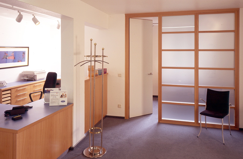 Wenn eine Praxis so freundlich gestaltet ist, nimmt der Patient doch gerne eine ganze Weile im Wartezimmer Platz, oder? Zahnarztpraxis: Kunststoff beschichtet, Buche furniert. Trennwand aus satiniertem Schallschutz-Glas mit Buchenrahmen.
