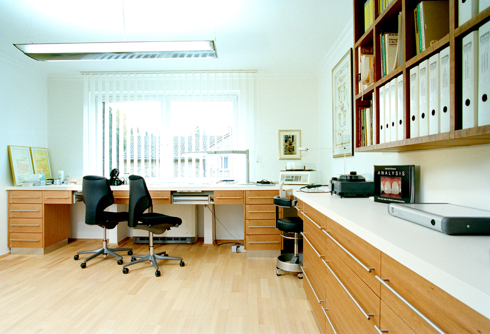Folgende Materialien haben wir im Empfang verwendet: Arbeitsflächen aus Kambala massiv und Fronten aus weiß lackiertem MDF. Und im Labor: Arbeitsplatte aus Mineralstoff, Blenden furniert mit amerikanischer Kirsche, natur lackiert.