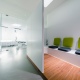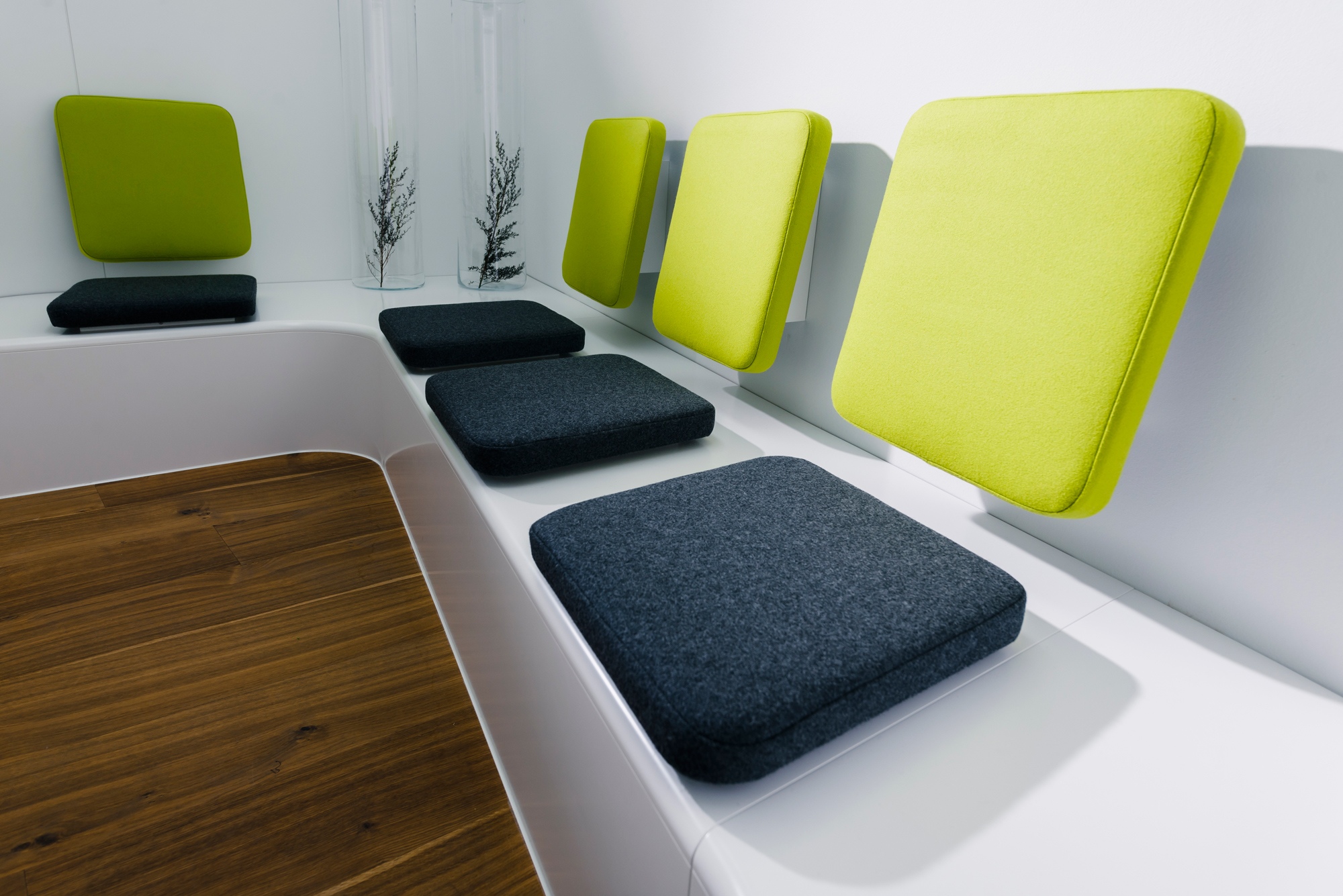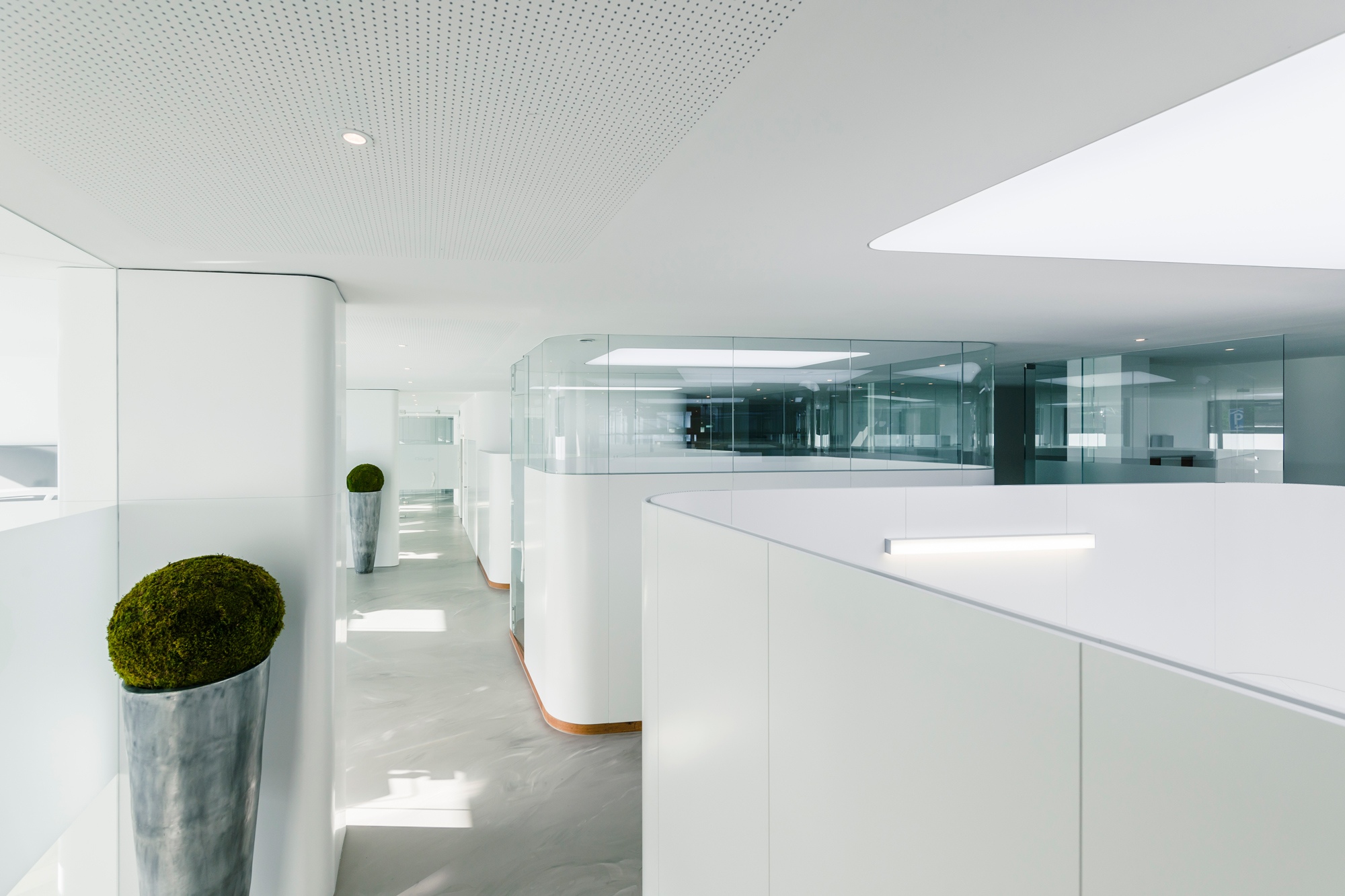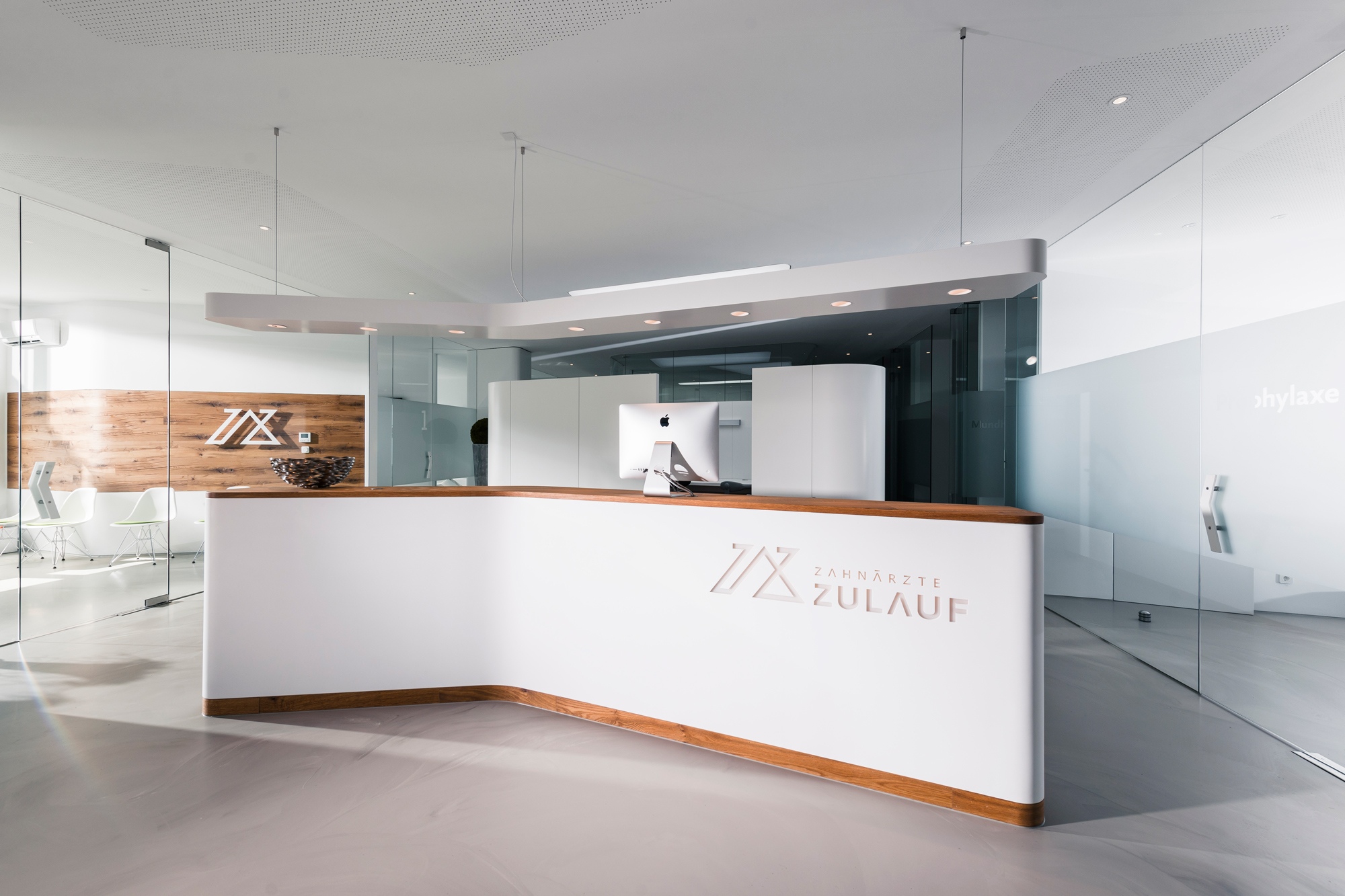 Mit erheblichem Aufwand wurden hochwertige Materialien wie z.B Glas bei den Oberlichtern und Corian bei der Empfangstheke, dem hinterleuchteten Praxislogo und den Glastürgriffen unter Hitzeeinwirkung verformt bzw. mit Hilfe von CNC Bearbeitung gefertigt. Gerundete Raumwandelemente wurden in Sandwichbauweise hergestellt und mit Hilfe von CNC gefertigten Hilfsformteilen mittels Vakuumpresse in Form gebracht.