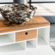 Neben Glas und Corian kam u.a. geölte, rustikale Eiche zur Verwendung, z.B. für die handwerklich gefertigten Bodendielen oder der Tischplatte des Besprechungstisches, Elemente, die eigens in einer „Räucherkammer“ auf den gewünschten Farbton geräuchert wurden. Für dekorative Wandverkleidungselemente wurde Eichefurnier verwendet, welches aus alten, Eichenkonstruktionsbalken gemessert wurde. Der überwiegende Teil der Ein- und Ausbauten wurde aus weiß lackiertem MDF-Material gefertigt.