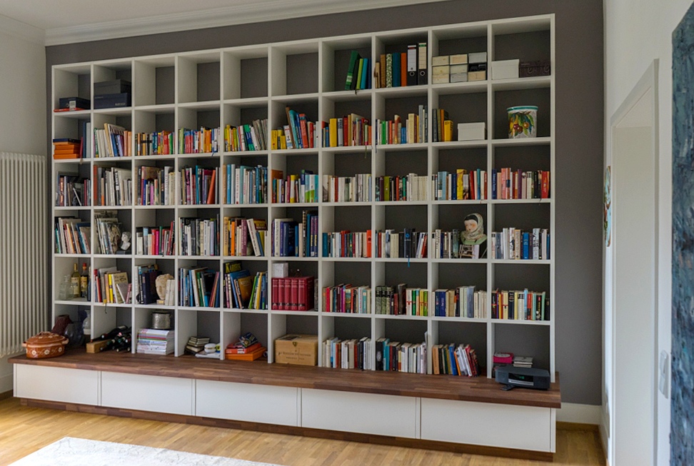 Der tiefe Schubladenunterbau bietet einigen Leuten Sitzgelegenheiten beim schmökern.