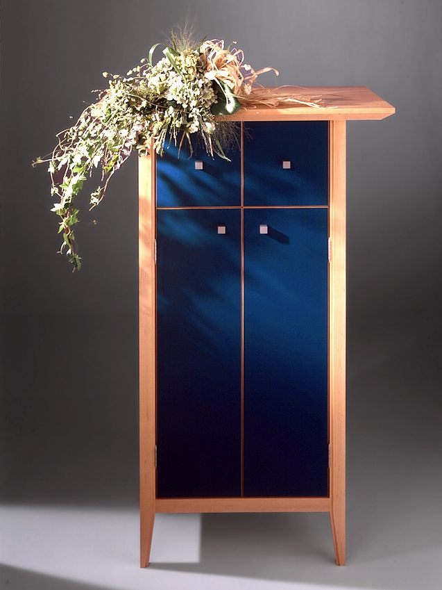 Die Blumen müssen Sie drauflegen, aber fürs restliche Dekor auf dem Vertiko sorgen wir. Aus Ahorn mit blauem Laminat.