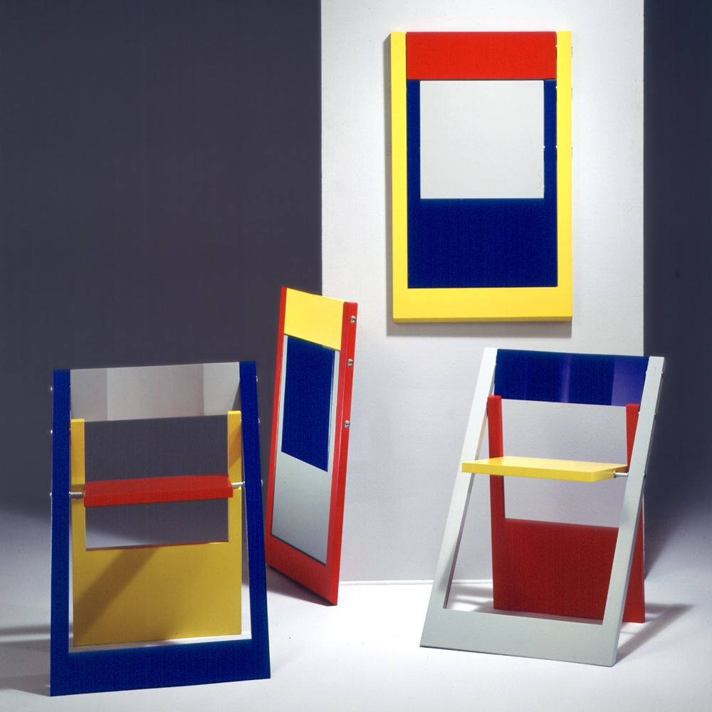 Der patentierte Klappstuhl lässt sich vollflächig zusammenklappen und verschwindet beispielsweise zwischen Wand und Schrank, sofern der Schlitz 3 cm beträgt. Oder er nimmt keinen Platz weg, wenn er an der Wand hängt und dabei an ein Werk von Mondrian erinnert. Durch die geneigte Sitzfläche und die gerundete schwenkbare Rückenlehne sitzt es sich auf ihm äußerst bequem.