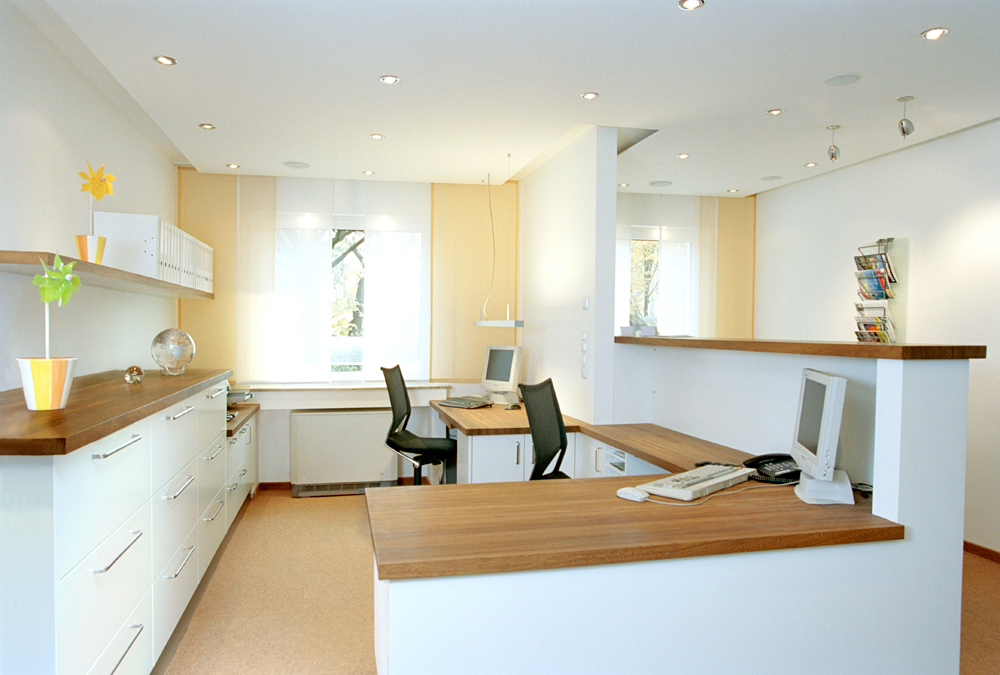 Ein warmes Willkommen in sonnigen Farben: So haben wir Empfang und Arbeitsbereich in einem Zahntechnik-Labor gestaltet.