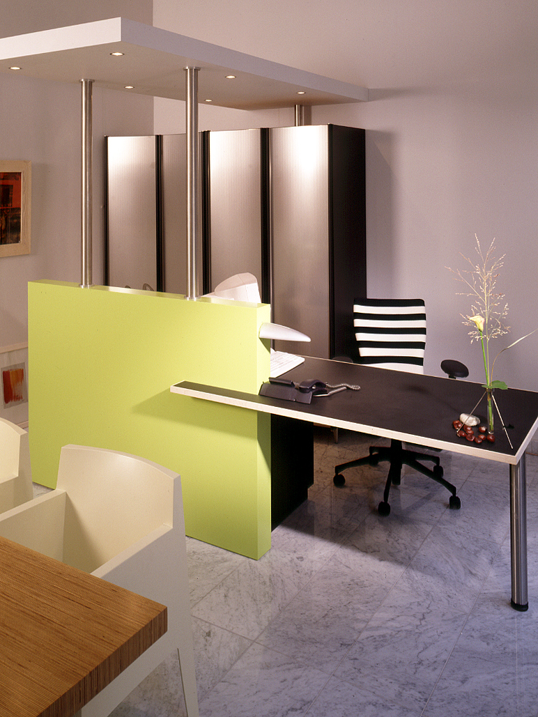 Wenn es auch kein Open-Air-Arbeitsplatz ist, leuchtet doch überm Schreibtisch der Himmel. Büroeinrichtung: Linoleum-Tischplatte, farbig lackierter Sichtschutz und Leuchtenhimmel.
