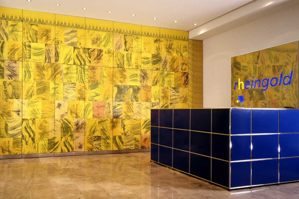 Im Foyerbereich des Institutes Rheingold führt kein Blick vorbei an einer künstlerisch gestalteten Wand des Kölner Malers Dieter Haack. Das Konzept dieses Raumes sowie der gesamten Umgestaltung des Hauses Rheingold plante die Architektin Belkis Memis-Haack.