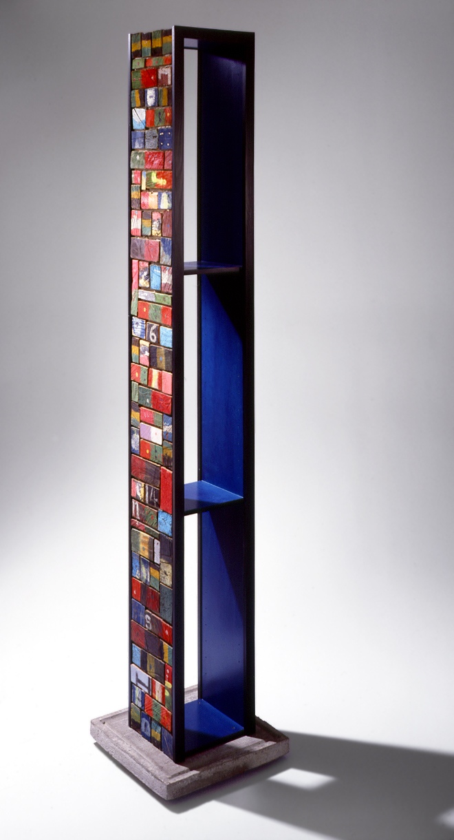 Bunt gewürfelt: Die Meranti-Klötzchen geben dem Regal Farbe, der Beton-Sockel Stand.