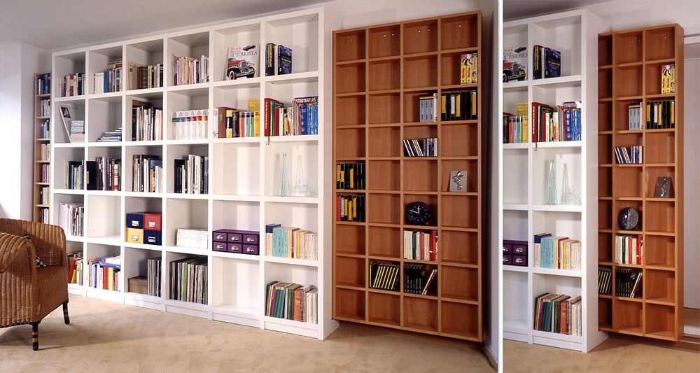 Nein, nicht das Problem, sondern das Regal! Bei diesem Modell aus Buche und lackiertem MDF wird der buchefurnierte Teil rechts einfach hinter das weiß lackierte Regal geschoben. Das geht ganz leicht, weil es auf Rollen gelagert ist. Und schon ist der Zugang zum Nachbarzimmer frei.