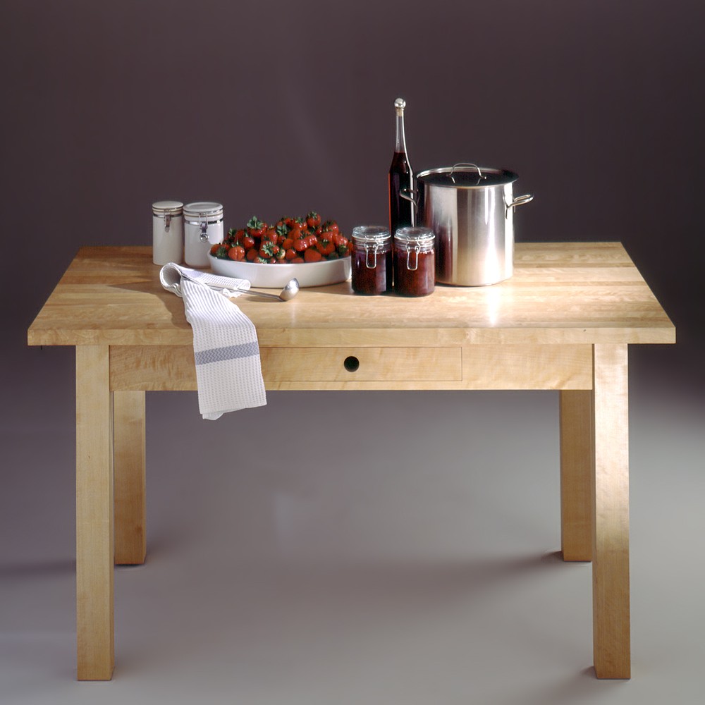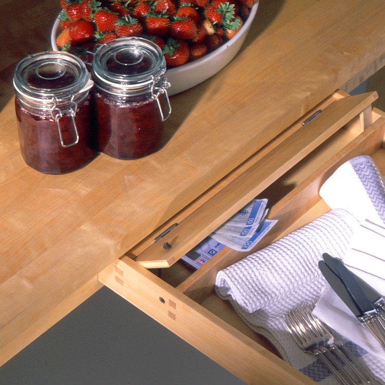 Pssst, dieser Küchentisch hat ein Geheimfach! Hinter dem Besteck finden Haushaltskasse oder Naschvorräte ein Versteck. Aus massiver, geölter Birke.