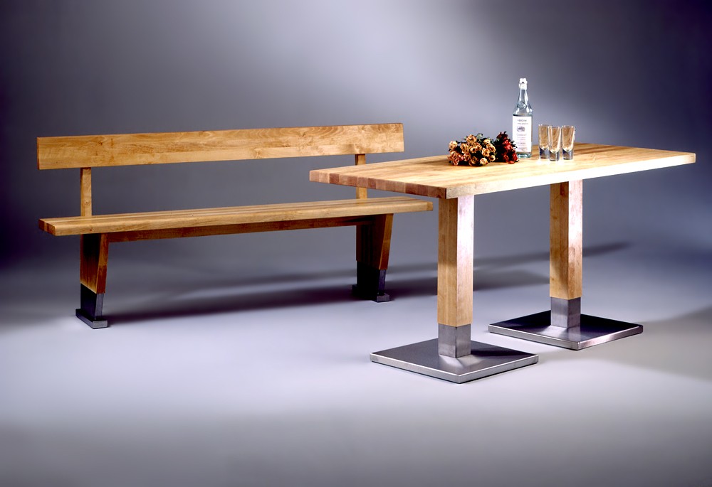 Macht viel her, braucht wenig Platz: Bank und Küchentisch sind aus Birke mit Edelstahl und passen ideal in kleine Küchen.