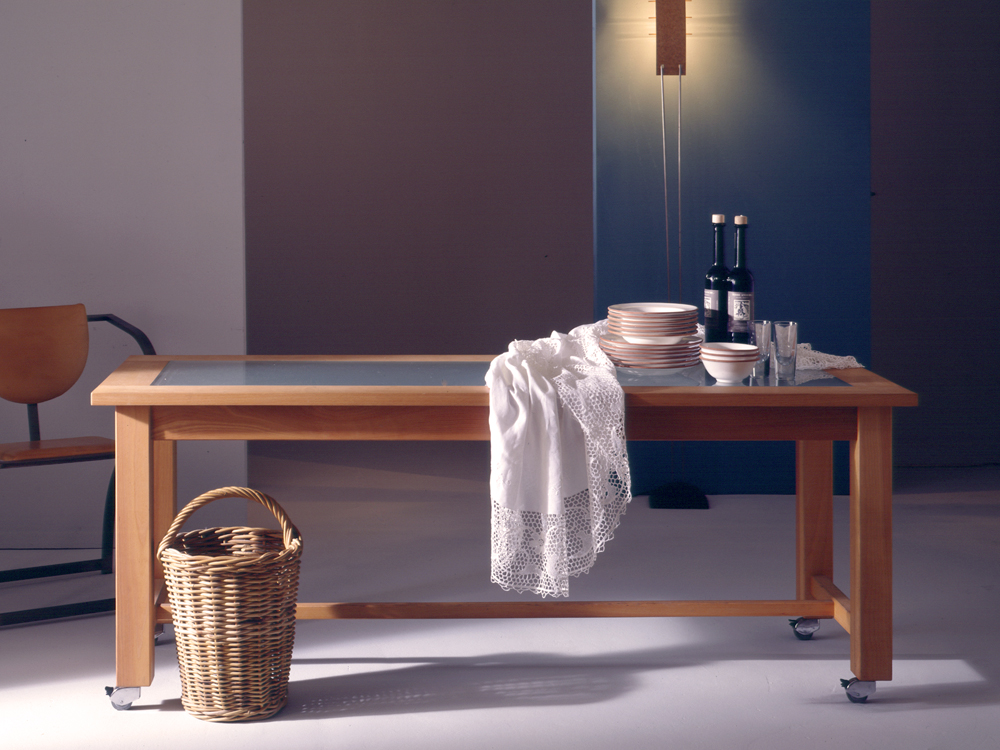 Dieser Tisch spielt eine Rolle, wo auch immer Sie ihn haben wollen. Einfach schubsen. Aus Buche mit mattierter Glasplatte.